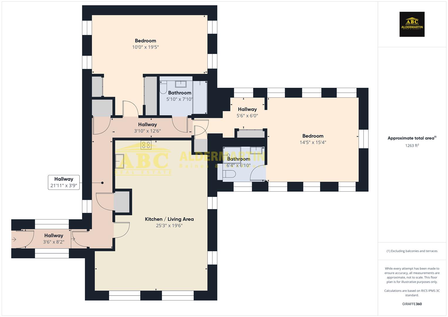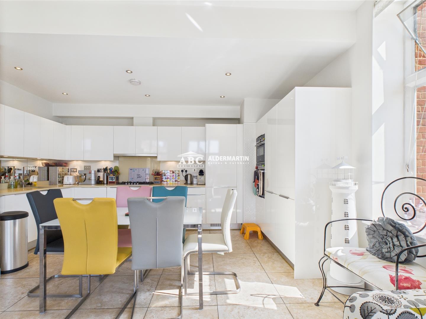 The two double bedrooms both have fitted wardrobes, and the kitchen, which is open plan to the spacious living area, has an abundance of fitted units and work surfaces.
